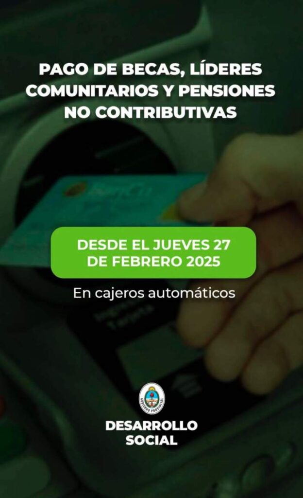 El Ministerio de Desarrollo Social de la provincia, informa a beneficiarios que desde este jueves 27 de febrero del 2025 estará disponible el pago de becas, pensiones no contributivas y líderes comunitarios dependientes de este organismo.
